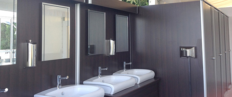 Composti da 6 cabine WC due top con ampio specchio da doppio lavabo. Due locali indipendenti per dividere l’accesso tra Uomini e Donne.